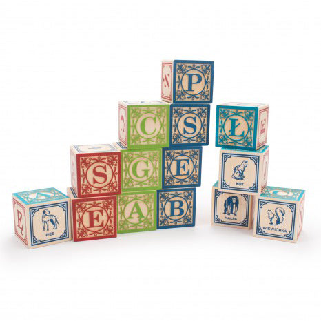 Polish ABC Blocks by Uncle Goose is a 32 piece Michigan basswood block set featuring the language of Poland. Each handcrafted block features embossed Polish design elements around two capital letters. An additional two letters, a number, and an animal along with its Polish translation adorn the other sides.