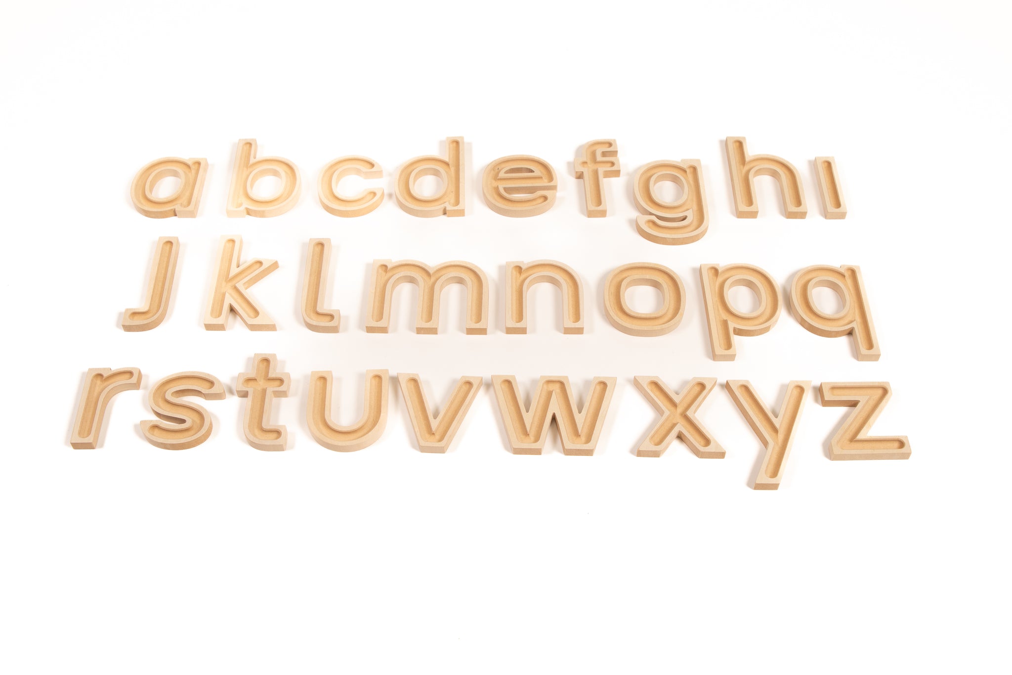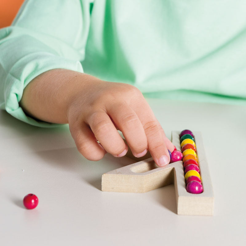 Each letter features a recessed groove that can be traced with fingers or filled with loose materials such as beads, beans, or pipe cleaners to create a play-based sensory experience.